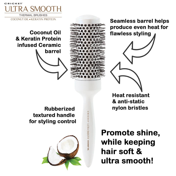 The award-winning, best-selling, Ultra Smooth Collection is has expanded into thermal brushes that deliver beautiful body results. Each seamless ceramic barrel has been infused with Coconut Oil and Keratin Protein that helps improve hair styling manageability and promotes shine.