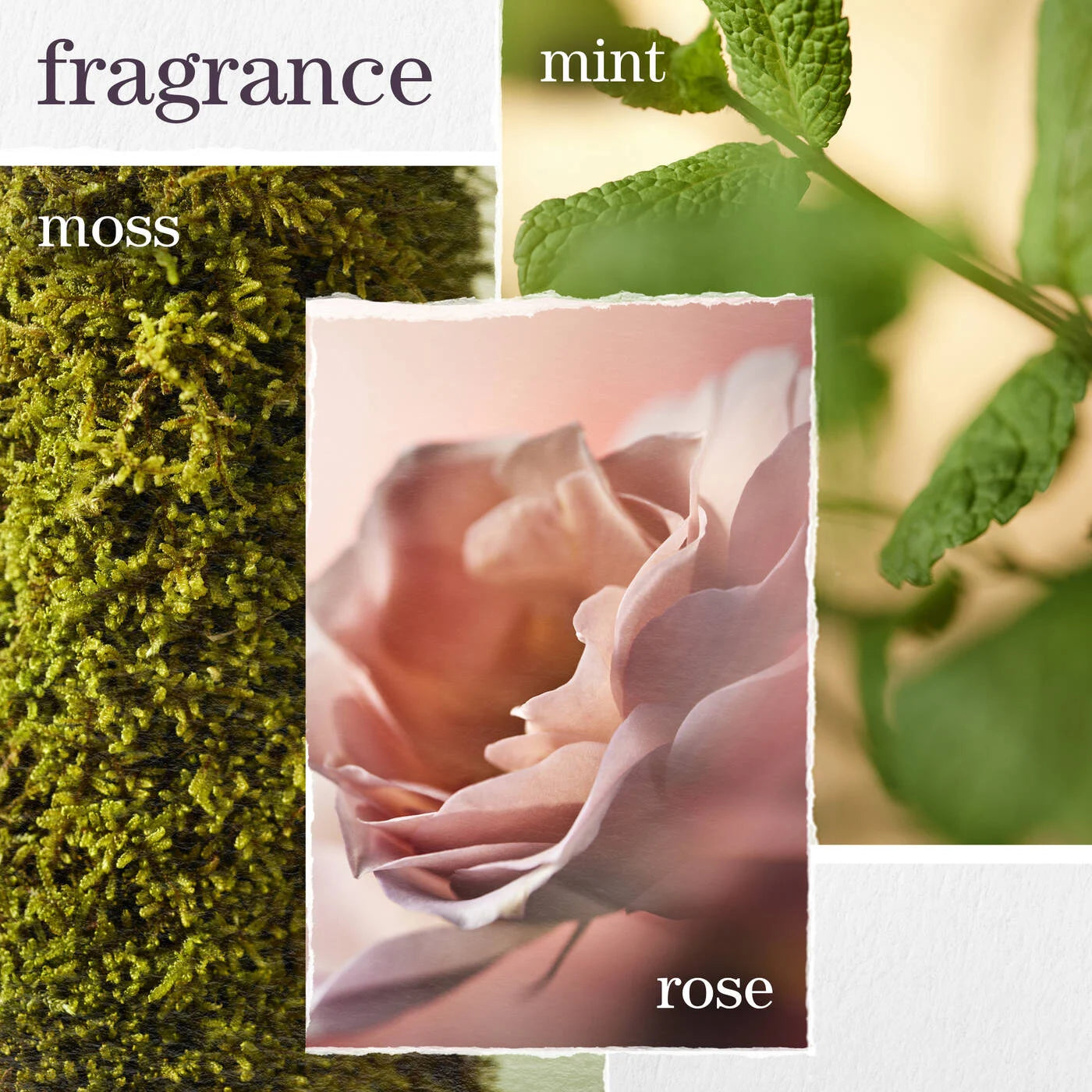 After the rain: Drift into a dreamlike embrace of the enchanting moments following a refreshing rainfall, guided by delicate notes of rose, moss and mint to create a sensorial shift that transports you to a space of serenity.