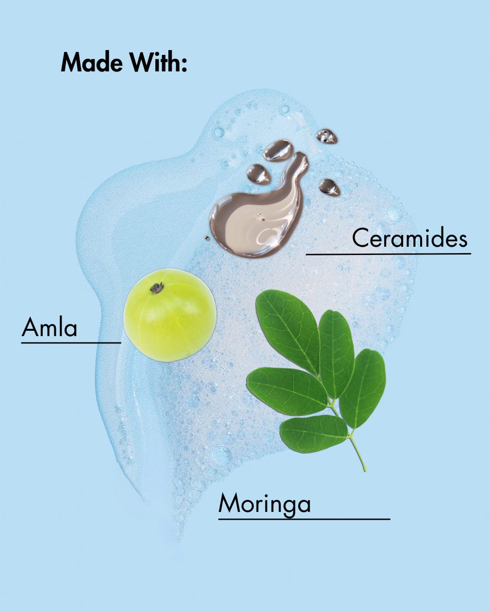 Aqua/Water/Eau, Cocamidopropyl Betaine, Disodium Laureth Sulfosuccinate, Betaine, Sodium Cocoyl Isethionate, Cocamide MIPA, Polyquaternium-7, Moringa Oleifera Leaf Extract, Phyllanthus Emblica Fruit Extract, Ceramide NP, Ceramide EOP, Ceramide AP, Phytosphingosine, Hydroxypropyl Bisstearamide MEA, Hydroxypropyl Bislauramide MEA, Pyrus Malus (Apple) Fruit Extract, Saccharum Offcinarum (Sugarcane) Extract, Camellia Sinensis Leaf Extract, Sodium Lauroyl Lactylate, Sodium Cocoyl Glutamate, Sodium Isethionate, Potassium Olivate, Coconut Acid, Fragrance/Parfum, Polyglyceryl-3 Diisostearate, Caprylyl Glycol, Ethylhexylglycerin, Sodium Benzoate, Hydrogenated Polydecene, Polyglyceryl-10 Stearate, Citric Acid, Stearic Acid, Trisodium Dicarboxymethyl Alaninate, Sodium Chloride, Maltodextrin, Potassium Sorbate, Limonene