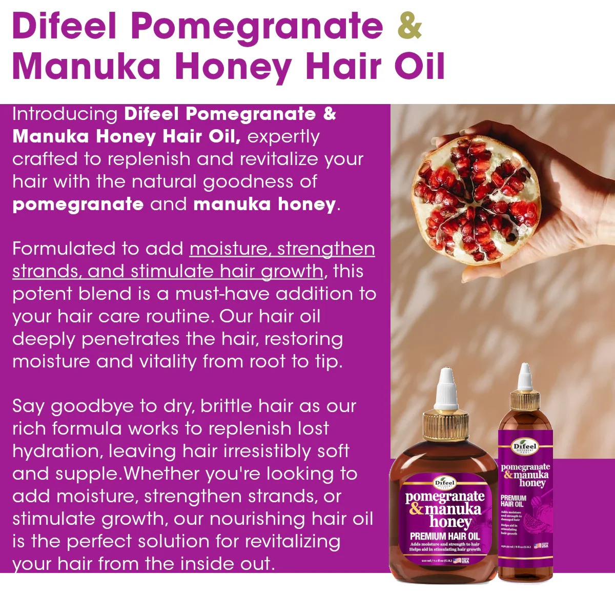 Introducing Difeel Pomegranate & Manuka Honey Hair Oil, expertly crafted to replenish and revitalize your hair with the natural goodness of pomegranate and manuka honey. Formulated to add moisture, strengthen strands, and stimulate hair growth, this potent blend is a must-have addition to your hair care routine.