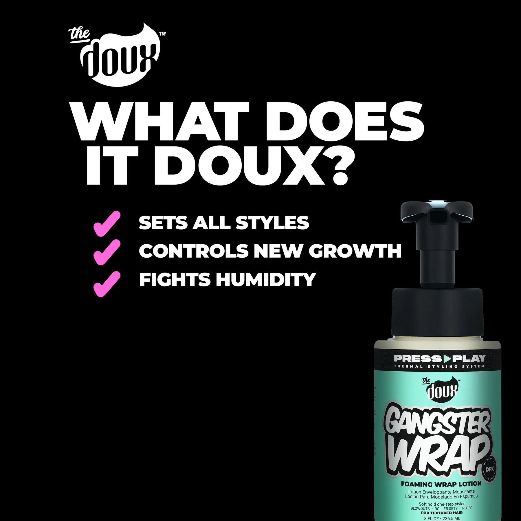 GANGSTER WRAP's your ride-or-die for pixies, roller sets, and wraps. This heat-protecting styler shuts down root and new growth swelling. Frizz? Humidity? Consider 'em handled. Doubles as a soft-hold mousse for your curly days.