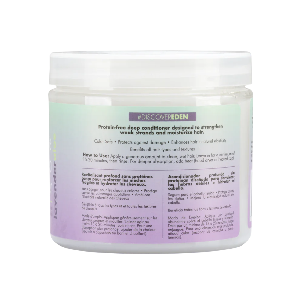 This natural deep conditioner is a thick, creamy protein-free hair mask designed to help strengthen weak strands susceptible to breakage. Lavender Oil helps to battle hair loss and protect against further damage. Enhances the hair's natural elasticity. Aloe helps to replenish and moisturize dry hair. Combats scalp issues. Safe for natural hair, color-treated hair, and chemically-processed hair.